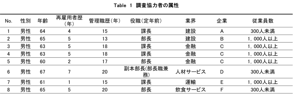 調査協力者は,対象者の繋がりを通じて調査対象をリクルーティングする手法である機縁法により定年直前まで管理職であった定年後再雇用8名とした。調査協力者の所属する企業は6社で,従業員1000人を超える企業が3社,従業員300人未満の企業が3社であった。8名の調査協力者の詳細の属性をTable 1に示す。調査協力者は男性に限定したものではないが,結果として全員男性となった。