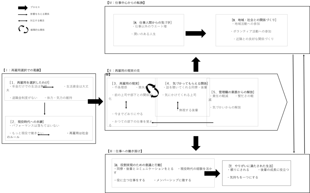 [1.再雇用を選択したわけ]は,[2.現役時代への未練]へ影響を与えていて,再雇用が始まるまでは,現役時代のへの心残りがあることが示された。[3.再雇用の現実]と[4.気づかってもらえる関係]の間には循環的な関係があり, [4.気づかってもらえる関係]が[3.再雇用の現実]の心理的負荷の軽減要因となって影響を与えている。そして[5.管理職の業務からの解放]も[3.再雇用の現実]の心理的負荷の軽減要因となって影響を与えることによって,【Ⅱ:再雇用の現実の克服】へと進む関係であることが示された。第1の流れの到達点は[6.役割実現のための意識と行動]から進んだ[7.やりがいに満たされた生活]である。第2の流れの到達点は,[8.仕事人間からの気づき]から進んだ [9.地域・社会との関係づくり]であることが示された。