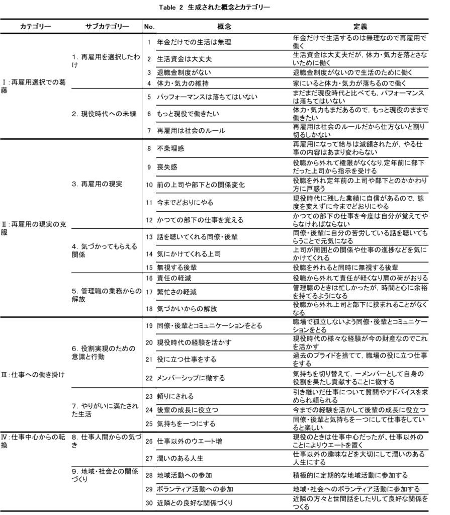 5概念が生成された。詳細はTable2に示す。【Ⅱ:再雇用の現実の克服】の流れから二つに分岐した第2の流れとして【Ⅳ:仕事中心からの転換】へと進む。[8.仕事人間からの気づき]は,再雇用の現実に直面したことによって,“現役時代は仕事人間だったたが,再雇用になってみると,なにか大切なものを置き去りにした感じがすることがある。これからは,仕事以外にも大切なものを見つけてウエートを置いていきたい(No.2)”という「仕事以外のウエート増」である。そして,“仕事以外に趣味などを大切にして潤いのある生活を送りたい(No.4)”という「潤いのある人生」である。