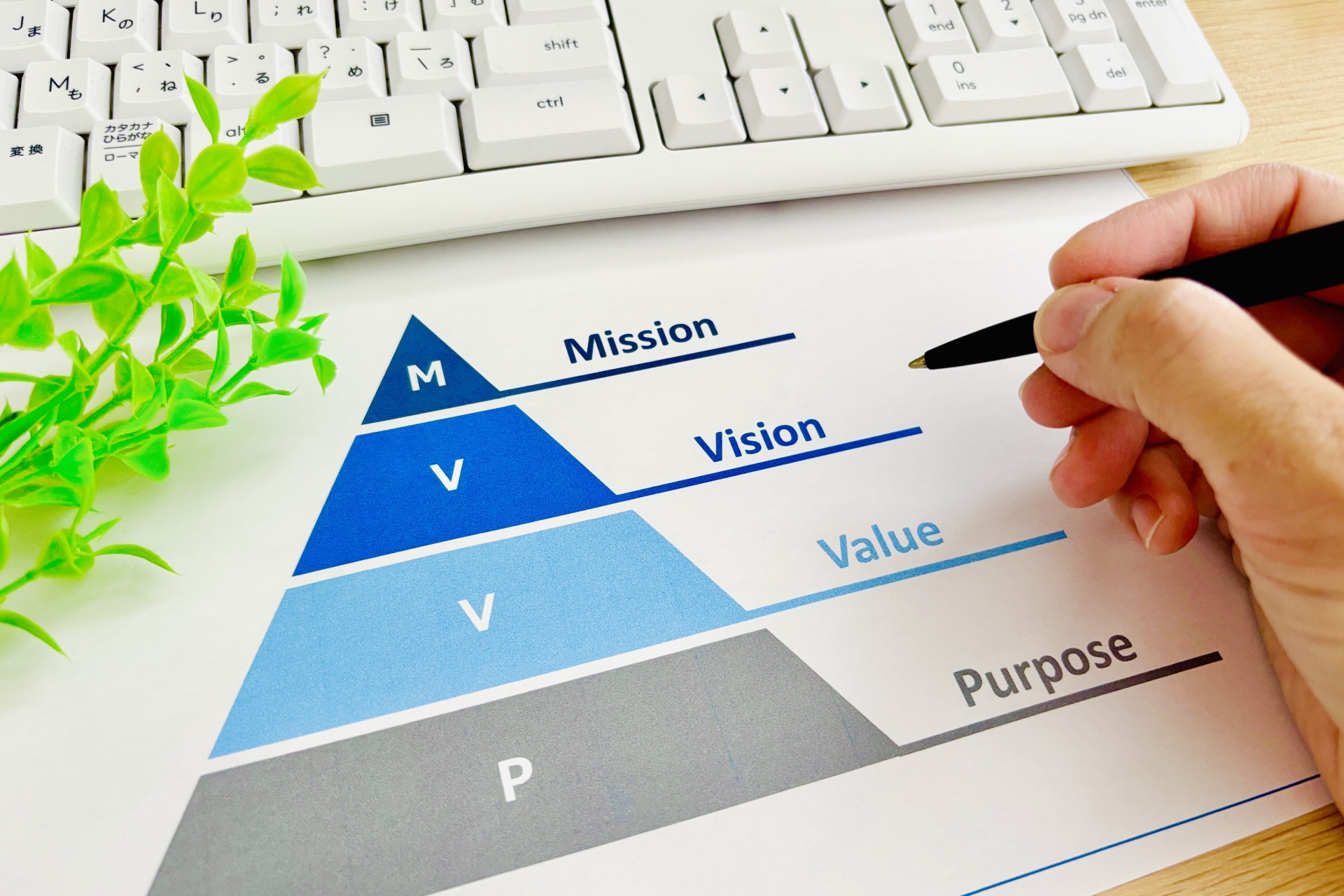 次に「MVV」は、Mission(使命)、Vision(目指す姿)、Value(価値観)の頭文字を取ったフレームです。Missionは「何を実現する組織なのか」、Visionは「どんな未来を目指すのか」、Valueは「どのような行動を大切にするのか」を示します。MVVは戦略や組織設計と結びつけやすく、経営管理の文脈でよく用いられます。